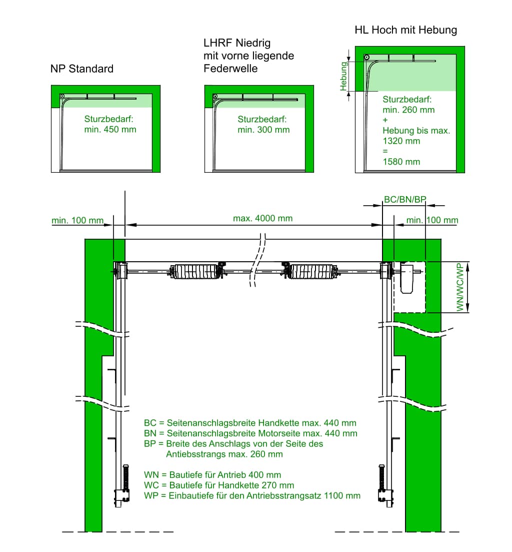 - HL = Hoch mit Hebung: min. Sturzbedarf: 470 mm (Hebung bis max. 1320 mm) + 260 mm = 1580 mm